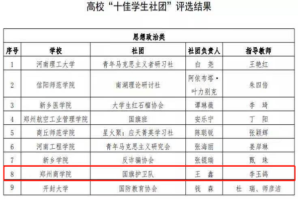 日前,省委教育工委、省教育厅公布了2021年全省高校学生社团品牌建设系列活动的遴选结果,我校国旗护卫队经学校推荐、专家评审等环节,在全省100多所高校近千个社团中脱颖而出,成功入选河南省高校“十佳学生社团”;我校心理健康社团“驿心社”工作案例入选全省学生社团优秀工作案例。