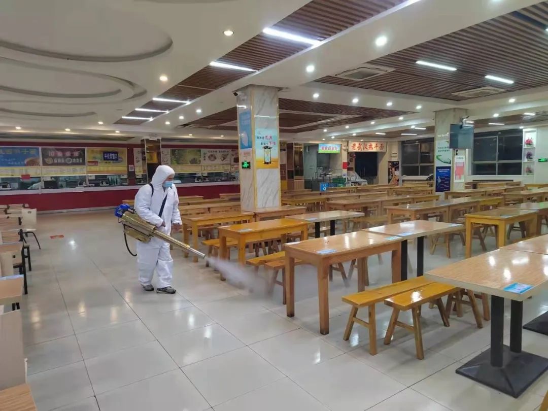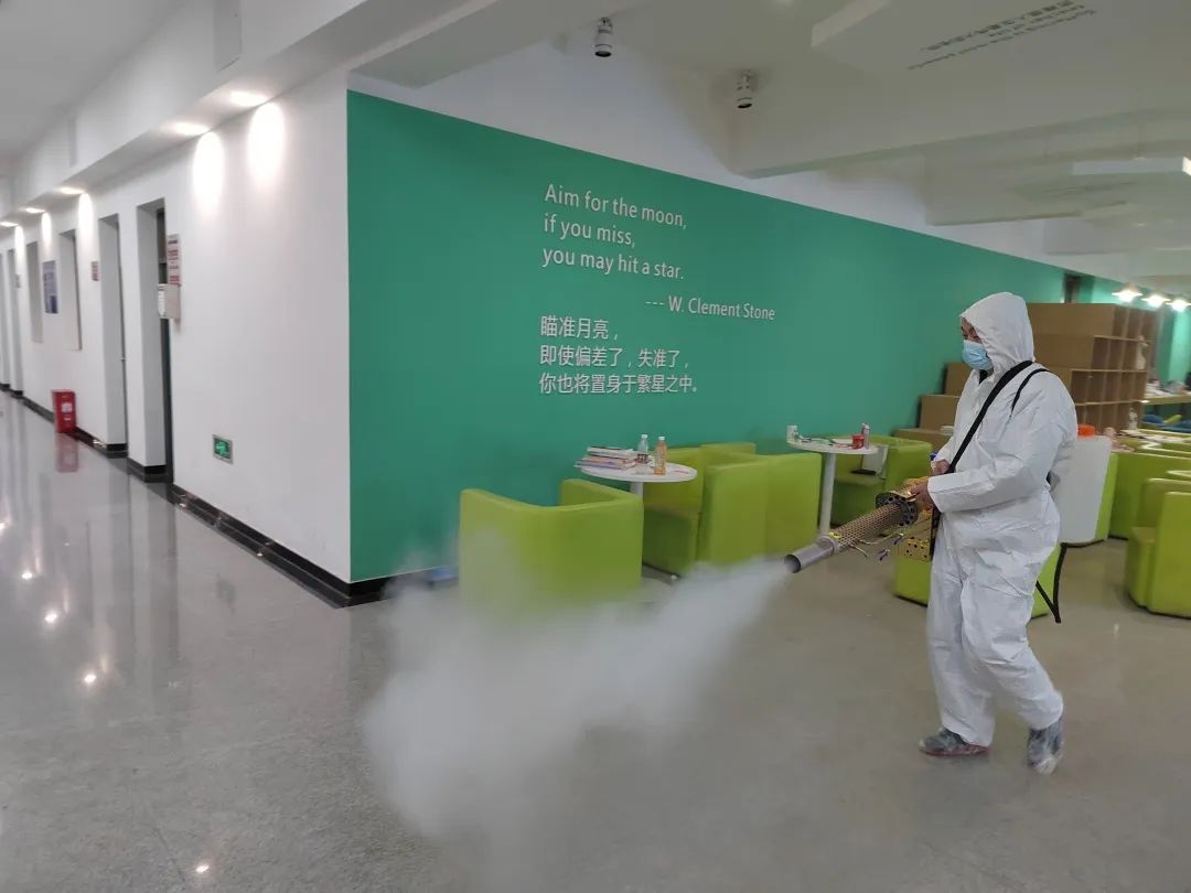 为确保消杀工作安全、高质量,学校制定了校园消杀工作方案,对校园各个区域的消杀任务进行了明确分工、责任到人,每个区域同时安排了监督人员,严格按照卫生消杀管理标准规范操作,落实落细各项工作要求。在室内消杀作业时,消杀工作人员人工手持弥雾机喷洒含氯消毒剂的方式分别对学校教室、办公区、宿舍、餐厅、公共区域等进行全区域立体式消杀,特别是楼梯扶手、桌椅、宿舍水房等人体密切接触的地方,进行反复密集消毒处理,不遗漏一个角落;在室外消杀作业时,采用雾炮车喷洒含氯消毒剂的方式进行,在东西校区连续作业近4小时,完成校园公共道路、宿舍楼周边等区域消杀。