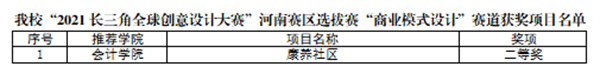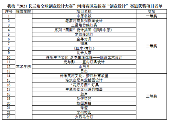本次大赛于2021年6月启动,全省参赛高校86所,参赛作品2200余项。经过积极宣传发动,我校艺术学院、会计学院、工商学院、金贸学院、外语学院共组织学生项目89个参与本次大赛。大赛分为“创意设计”“商业模式设计”“电商营销实战”三个赛道。经过校内评审,我校共推荐23个“创意设计”赛道学生项目和3个“商业模式设计”赛道学生项目进入省赛。通过线上、线下评审,最终我校艺术学院学生项目“中原名城”荣获“创意设计”赛道一等奖,“三星堆竹编灯具”等12个项目荣获二等奖,“鼓声”等10个项目荣获三等奖,我校会计学院学生项目“康养社区”荣获“商业模式”赛道二等奖。