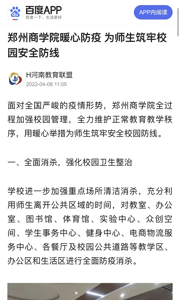 4月8日,百度新闻以“999策略白菜手机论坛暖心防疫 为师生筑牢校园安全防线”为题,报道我校全过程加强校园管理,全力维护正常教育教学秩序,用暖心举措为师生筑牢安全校园防线,凝聚师生战胜疫情的信心和决心。现将原文摘录如下: