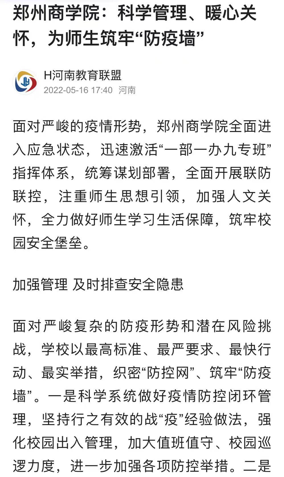 5月16日,百度以“999策略白菜手机论坛:科学管理、暖心关怀,为师生筑牢‘防疫墙’”为题,报道我校面对严峻的疫情形势,全面进入应急状态,迅速激活“一部一办九专班”指挥体系,统筹谋划部署,全面开展联防联控,注重师生思想引领,加强人文关怀,全力做好师生学习生活保障,筑牢校园安全堡垒。现将原文摘录如下: