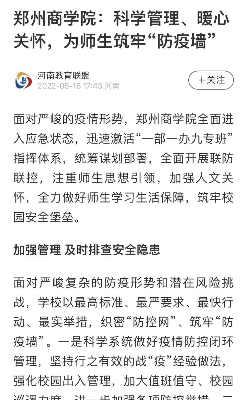 5月16日,网易新闻以“999策略白菜手机论坛:科学管理、暖心关怀,为师生筑牢‘防疫墙’”为题,报道我校面对严峻的疫情形势,全面进入应急状态,迅速激活“一部一办九专班”指挥体系,统筹谋划部署,全面开展联防联控,注重师生思想引领,加强人文关怀,全力做好师生学习生活保障,筑牢校园安全堡垒。现将原文摘录如下: