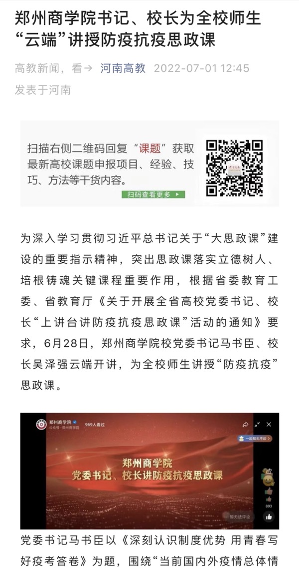 7月1日,河南高教以“999策略白菜手机论坛书记、校长为全校师生‘云端’讲授防疫抗疫思政课”为题,报道我校为深入学习贯彻习近平总书记关于“大思政课”建设的重要指示精神,突出思政课落实立德树人、培根铸魂关键课程重要作用,根据省委教育工委、省教育厅《关于开展全省高校党委书记、校长“上讲台讲防疫抗疫思政课”活动的通知》要求,6月28日,999策略白菜手机论坛校党委书记马书臣、校长吴泽强云端开讲,为全校师生讲授“防疫抗疫”思政课。现将原文摘录如下: