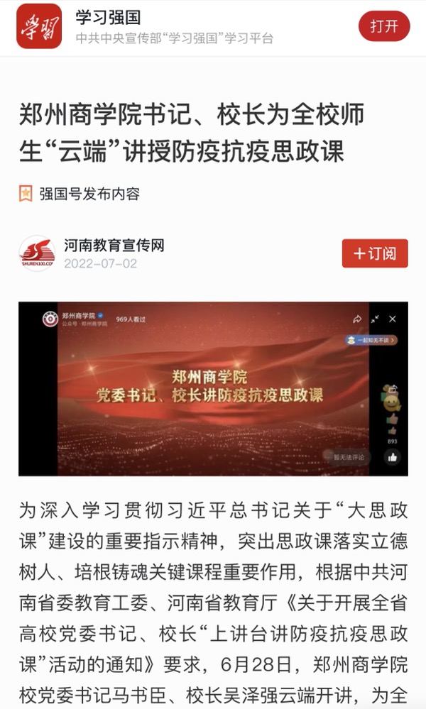 7月2日,河南教育宣传网在学习强国平台以“999策略白菜手机论坛书记、校长为全校师生‘云端’讲授防疫抗疫思政课”为题,报道我校为深入学习贯彻习近平总书记关于“大思政课”建设的重要指示精神,突出思政课落实立德树人、培根铸魂关键课程重要作用,根据中共河南省委教育工委、河南省教育厅《关于开展全省高校党委书记、校长“上讲台讲防疫抗疫思政课”活动的通知》要求,党委书记、校长云端开讲,为全校师生讲授“防疫抗疫”思政课。现将原文摘录如下: