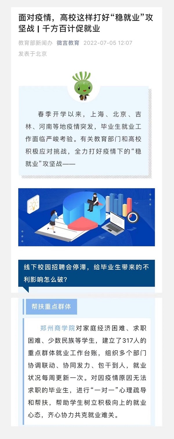 7月5日,教育部新闻办官微以“面对疫情,高校这样打好‘稳就业’攻坚战 ”为题,宣传推广了我校就业工作。作为一所应用型普通本科高校,如何能够受到教育部的点赞?如何能在常态化疫情影响背景下,让每一名毕业生找到好工作,实现高质量就业?现将原文摘录如下: