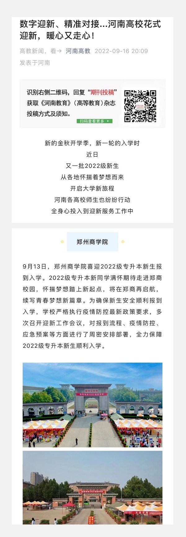 9月16日,河南高教以“数字迎新、精准对接...河南高校花式迎新,暖心又走心!”为题,报道我校专升本开学迎新工作。现将原文摘录如下: