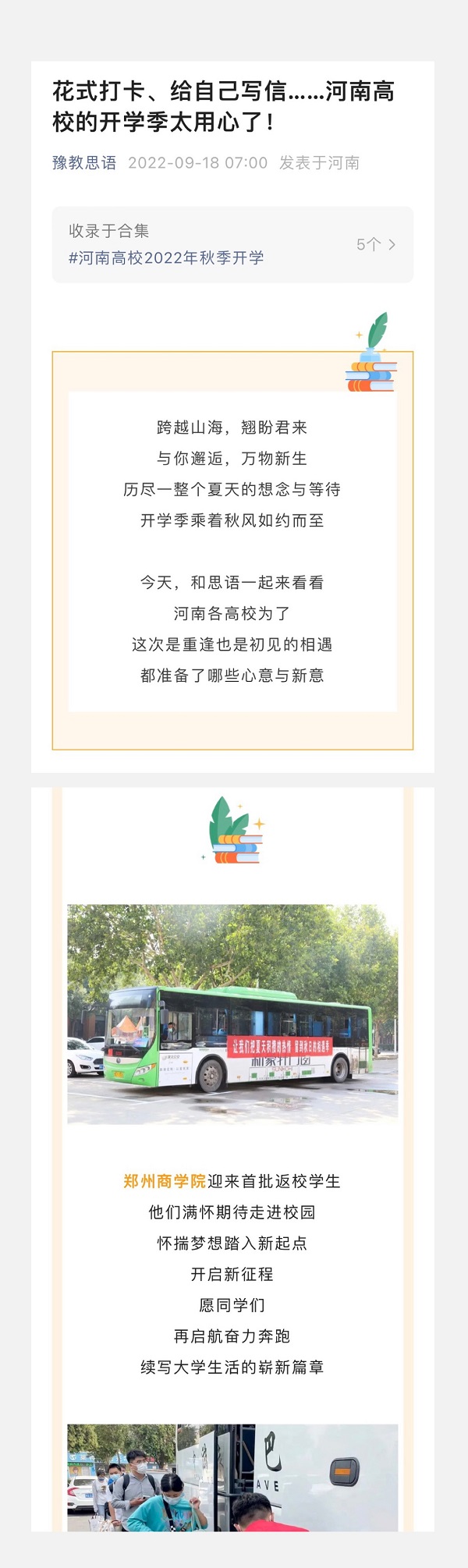 跨越山海,翘盼君来;与你邂逅,万物新生;历尽一整个夏天的想念与等待,开学季乘着秋风如约而至。今天,和思语一起来看看河南各高校为了,这次是重逢也是初见的相遇,都准备了哪些心意与新意?