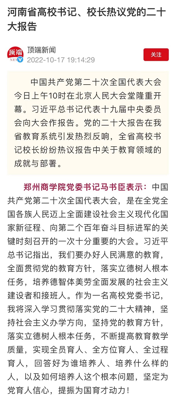 10月17日,顶端新闻以“河南省高校书记、校长热议党的二十大报告”为题,报道我校党委书记、校长学习党的二十大报告感悟。现将原文摘录如下:
