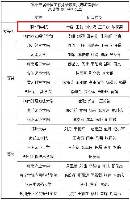 近日,由河南省教育厅主办的第十三届全国高校外语教学大赛河南省决赛(思政微课组)落下帷幕。我校英语专业韩浩老师负责的英文写作教学团队提交的参赛作品在决赛中脱颖而出,荣获特等奖。