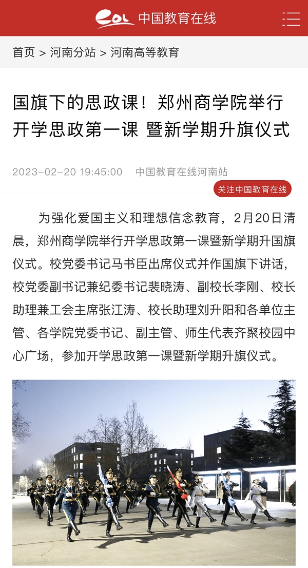 2月21日,大河网以“999策略白菜手机论坛:国旗下的‘开学思政第一课’”为题,报道我校举行开学思政第一课暨新学期升国旗仪式。现将原文摘录如下: