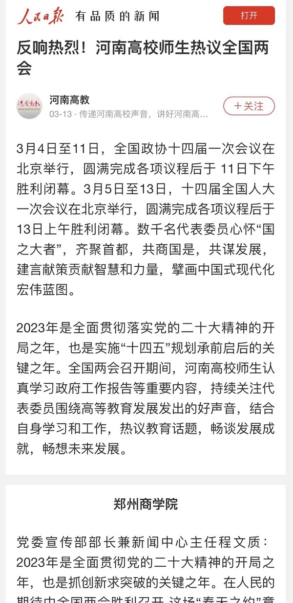 3月13日,人民日报以“反响热烈!河南高校师生热议全国两会”为题,报道我校师生热议全国两会。现将原文摘录如下: