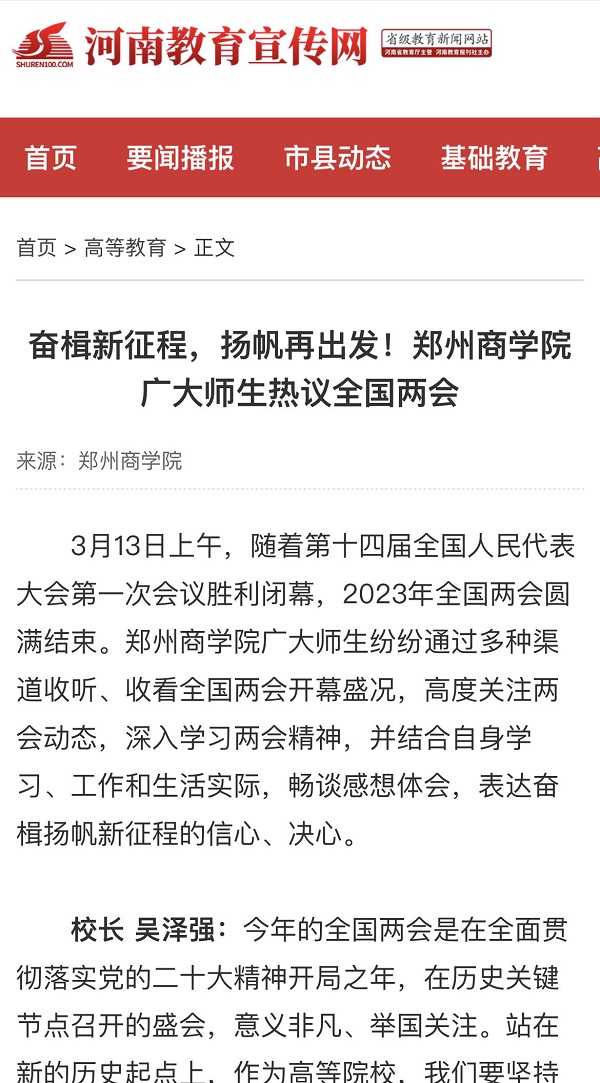 3月16日,河南教育宣传网以“奋斗新征程,扬帆再出发!999策略白菜手机论坛广大师生热议全国两会”为题,报道我校师生学习全国两会精神的反响热烈。现将原文摘录如下: