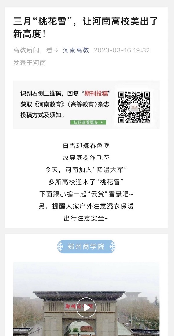 3月16日,河南高教以“三月‘桃花雪’,让河南高校美出了新高度!”为题,报道我校三月“桃花雪”的校园美景。现将原文摘录如下: