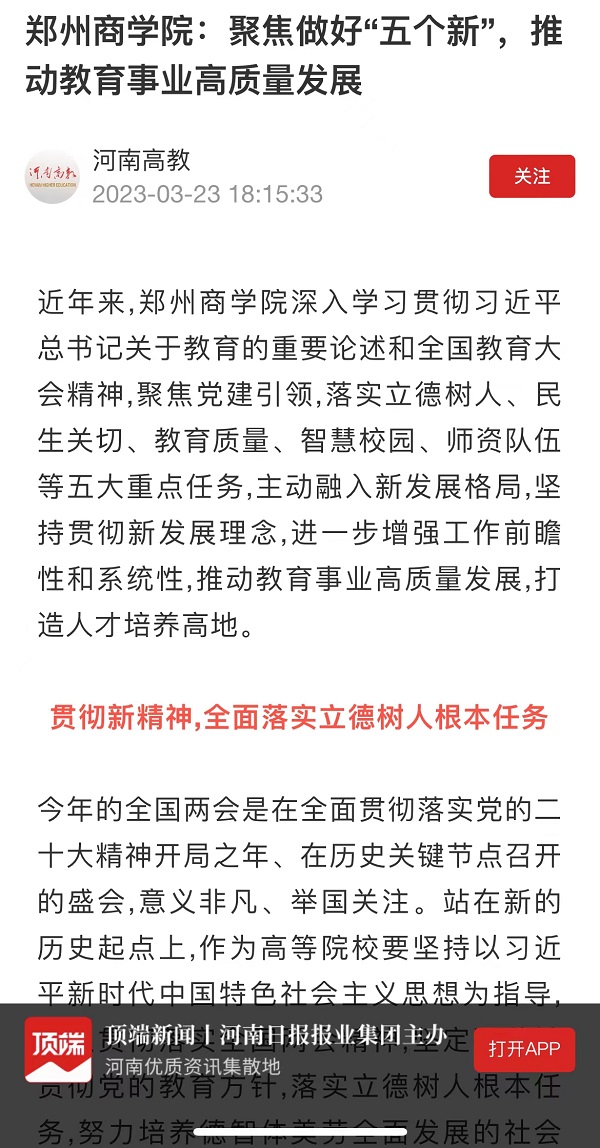 奋斗新征程,扬帆再出发。学校切实把全国两会精神转化为推动工作的强大动力,紧紧围绕全国和河南省经济社会发展的需求,服务"十大战略”,不忘为党育人、为国育才使命任务,着力培养堪当民族复兴大任的时代新人。