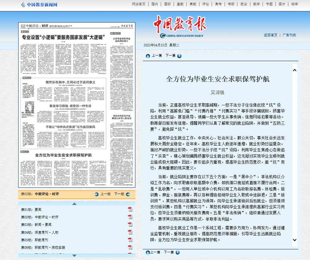 4月25日,《中国教育报》第02版中教评论·时评刊发我校校长吴泽强署名文章《全方位为毕业生安全求职保驾护航》。