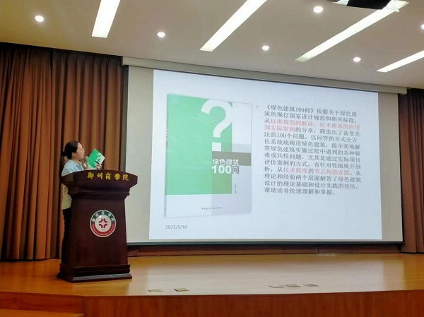 为加强校园文化建设,营造浓厚的校园文化氛围,全面推动书香校园阅读经典工程,让书香满校园。5月18日下午,图书馆与建工学院联合举办“郑商百家谈”系列讲堂第二十一期,邀请王丹老师在图书馆五楼学术报告厅为学生分享以“绿色建筑”为主题的书籍——《绿色建筑100问》《中国绿色建筑》。