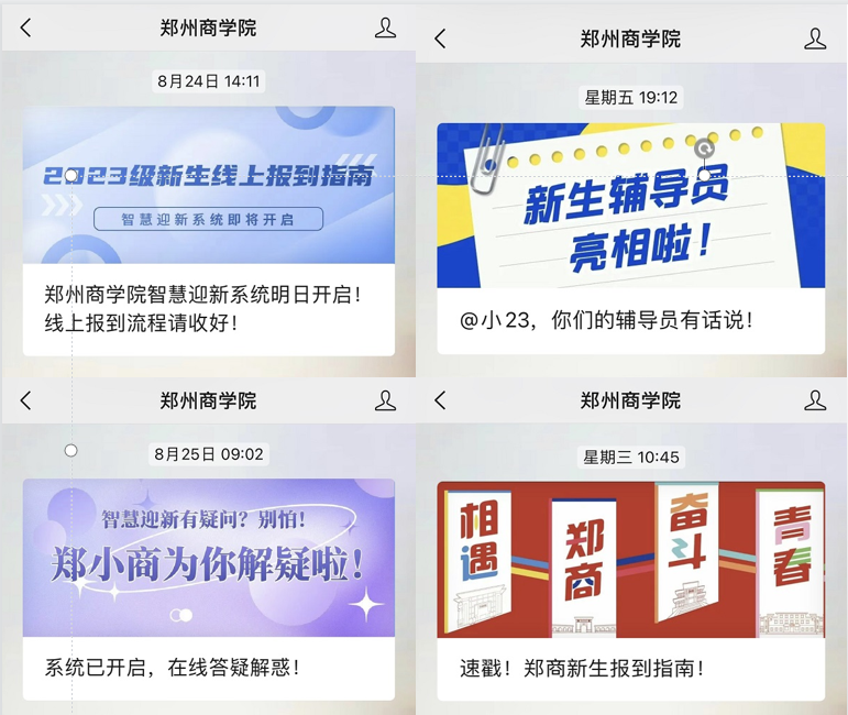 “图书馆升级改造了,快冲呀!”“学校的摆渡车不仅方便上课,还能坐上看看学校的风景呢!”“我们超级热情,遇到困难尽管来找!”“做郑商的花朵,拒绝摆烂。”“学校布置了好多定制的背景墙,记得去拍照留念哦!”“食堂很多,饭菜很好,下课不要抢!”“隐藏在迎新站点的文创小礼物,记得去领哦。”学姐学长们用自己的方式给郑商新人们温馨提示。