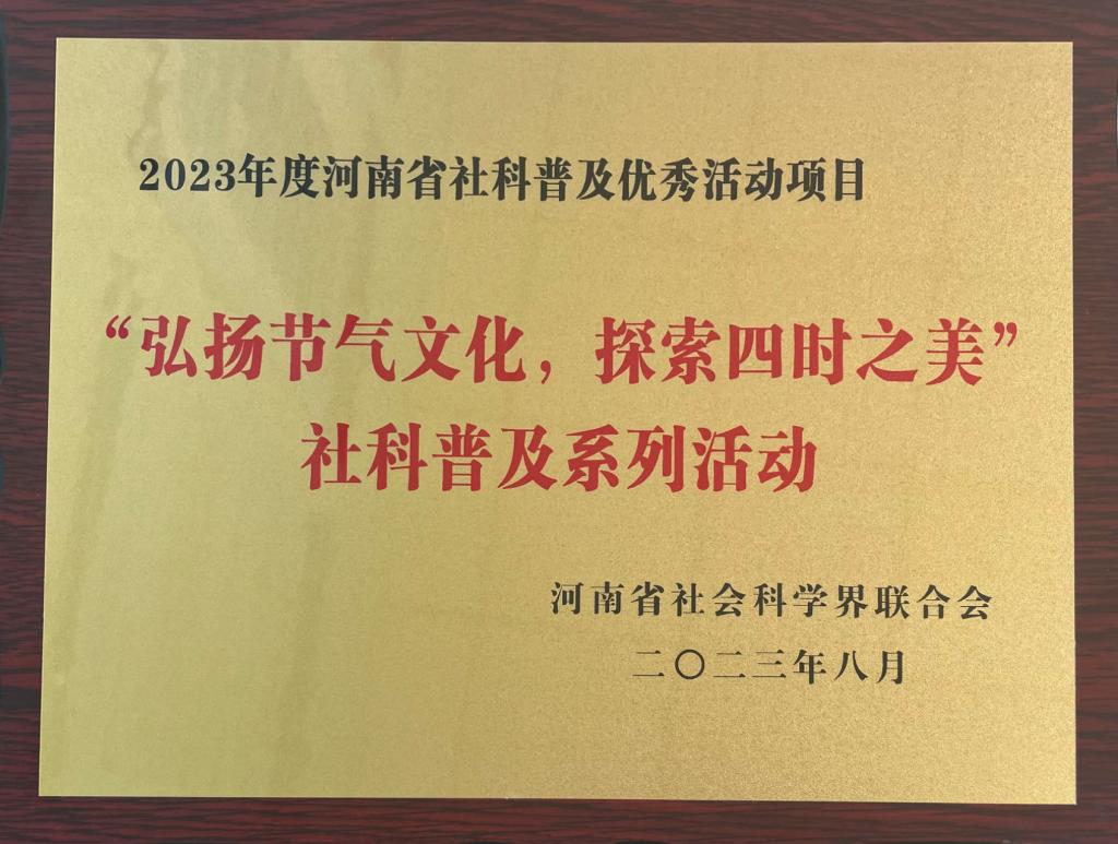 近日,由河南省委宣传部、河南省社科联联合主办的2023年河南省社会科学普及周开幕式在郑州举办。会上,通过视频形式对全省各地市的社科普及工作成效进行了集中展示。其中,我校社科联“弘扬节气文化,探索四时之美”社科普及系列活动荣获2023年度“河南省社科普及优秀活动项目”(全省共有河南师范大学社科联、河南理工大学社科联、周口师范学院社科联和我校社科联等4所高校社科联荣获此项目);我校传承二十四节气社科普及志愿服务团队荣获“河南省优秀社科普及志愿服务团队”。此外,我校科研处刘宁宁老师荣获“河南省优秀社科普及指导员”荣誉称号。