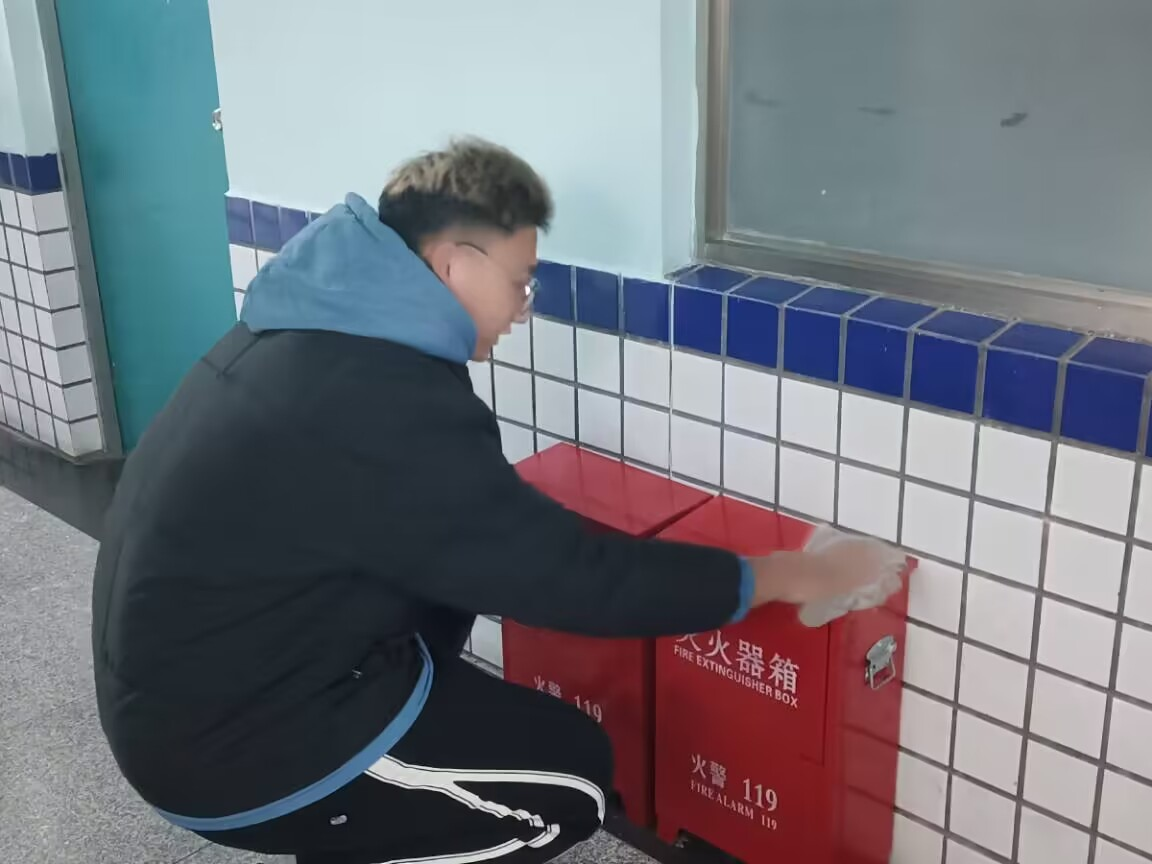 本次打扫的地点主要是二号教学楼内,重点是楼道卫生、教室卫生、消防栓安全检查以及教学楼周围的清扫。在活动过程中,同学们对教学楼四周区域进行了清扫,随后从楼道开始,清理垃圾、拖地、擦窗,并且对楼道的消防器材进行了擦拭,确保每个角落都一尘不染。