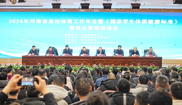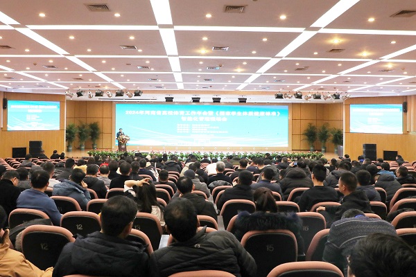 2024年1月16日—17日,由河南省教育厅指导、河南省学生体育总会主办、我校承办的2024年河南省高校体育工作年会暨《国家学生体质健康标准》智能化管理现场会在我校成功举办。河南省教育厅总督学刘林亚,河南省学生体育总会主席俞海洛,河南省教育厅体卫艺处处长舒卫方、副处长高根立,河南省学生体育总会常务副主席兼秘书长郭蔚蔚和我校党委书记吴建军、校长吴泽强等领导出席会议,河南省学生体育总会副主席、各单项协会负责人及全省高校体育学院院长、体育系(部)主任参加会议。会议由河南省学生体育总会常务副主席兼秘书长郭蔚蔚主持。