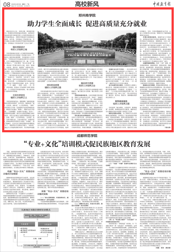 4月10日,《中国教育报》“高校新风”栏目以《助力学生全面成长 促进高质量充分就业》为题,聚焦报道了我校近年来高质量就业工作经验:一是强化顶层设计,布好人才培养之局;二是立足办学定位,植好人才培养之土;三是深化综合改革,铺好人才培养之路;四是融合多方资源,筑好人才培养之台;五是聚焦精准服务 绘好人才培养之图。