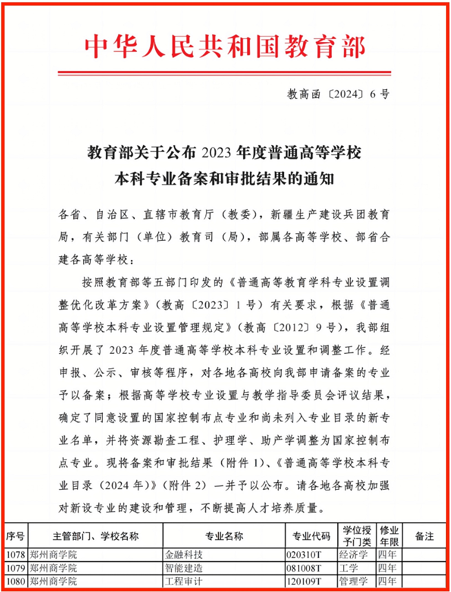 近日,教育部公布了2023年度普通高等学校本科专业备案和审批结果,我校申报的金融科技、智能建造、工程审计3个本科专业成功获批。