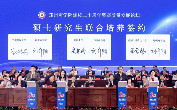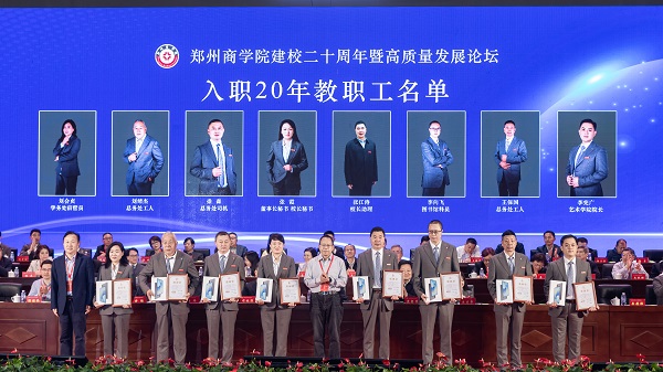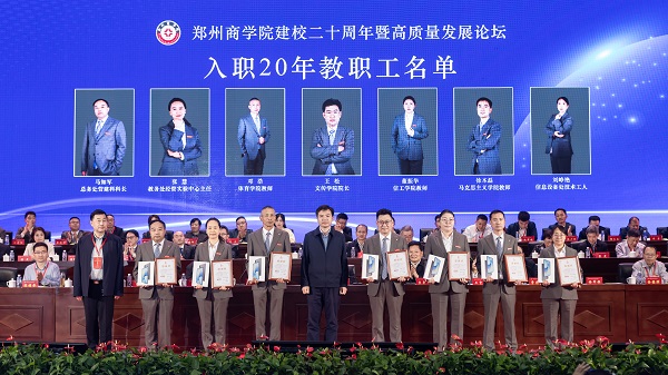 忆往昔勤耕不辍,展未来芳华正茂。庆祝建校20周年暨高质量发展论坛既是学校总结成绩、彰显内涵的新机遇,也是承前启后、继往开来的新起点,更是砥砺初心、凝聚合力的新契机。跨越第一个二十年,郑商人备受鼓舞、信心满怀;面向下一个二十年,郑商人意气风发、斗志昂扬。学校将以此次大会为契机,坚持以习近平新时代中国特色社会主义思想为指导,全面落实立德树人根本任务,为党育人、为国育才,凝心聚力、接续奋斗,为建设教育强国、教育强省贡献新的更大的力量。
