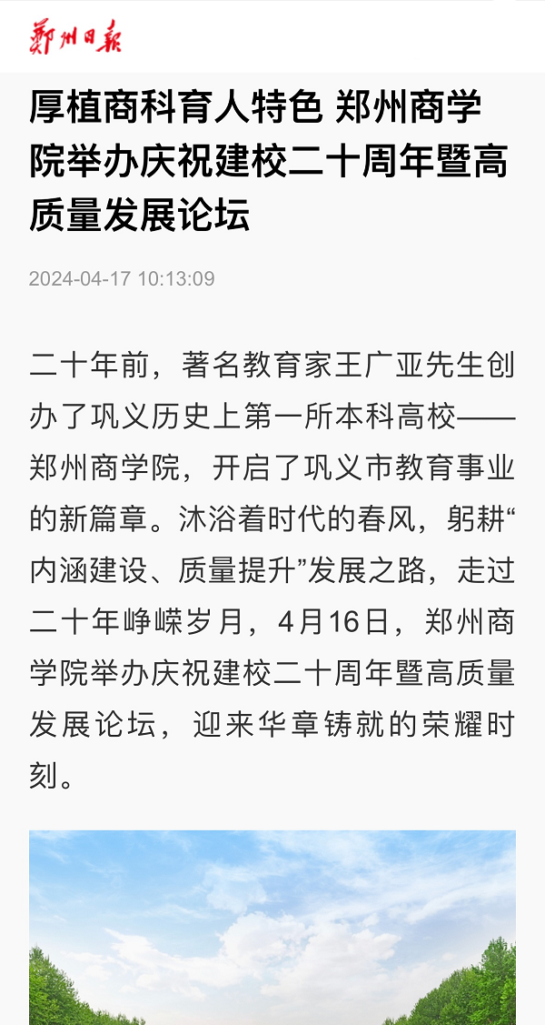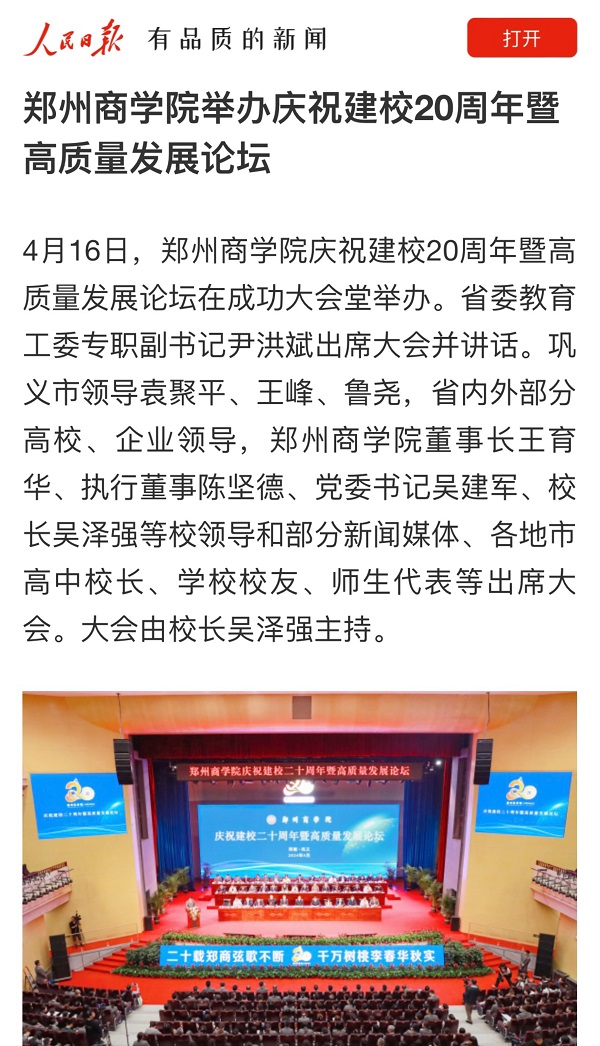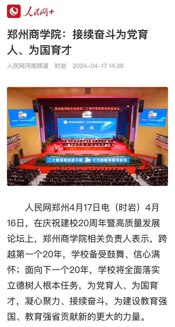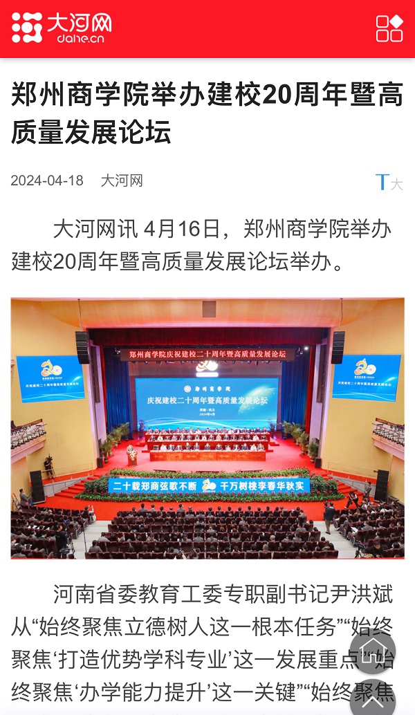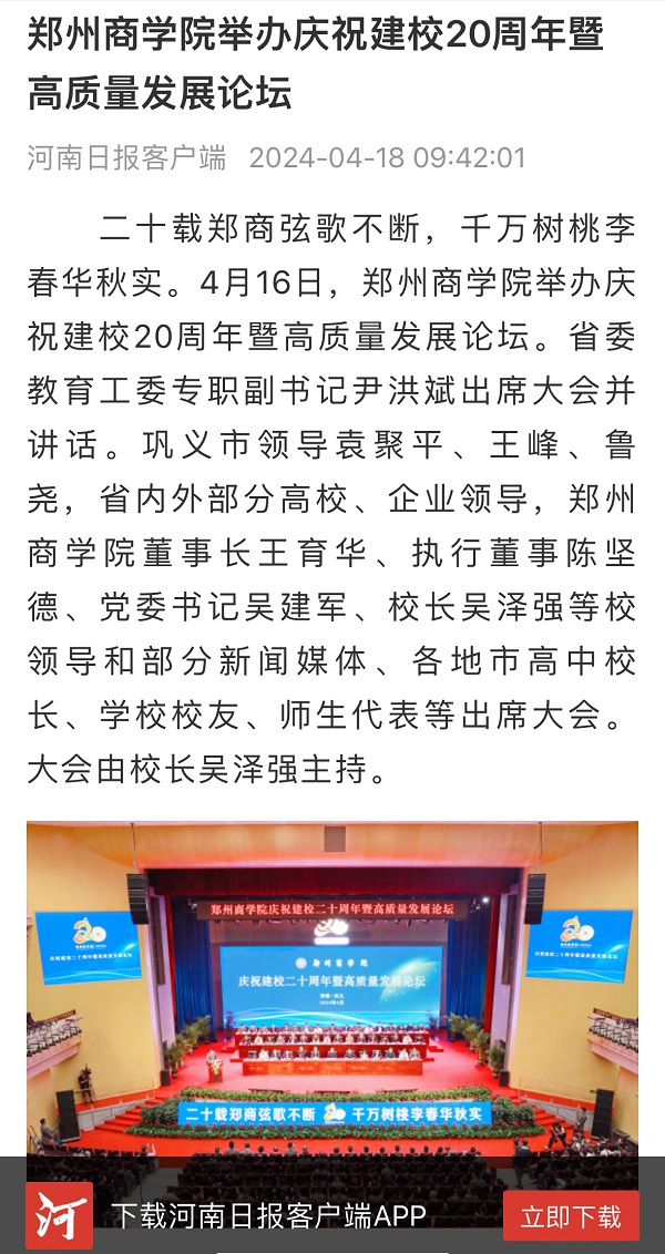4月16日,我校举办庆祝建校20周年暨高质量发展论坛,受到社会各界广泛关注。人民日报客户端、人民网、央广网、学习强国;河南日报、河南广播电视台(河南卫视新闻联播、午间新闻)、中国教育在线、大象新闻、顶端新闻、大河网、河南高教、河南教育宣传网、映象网、教育中原、今日头条、腾讯新闻;郑州日报、郑州电视台客户端、正观新闻等40余家国家级、省市级媒体聚焦报道,集中展示了我校20年来的办学历程和育人成果。