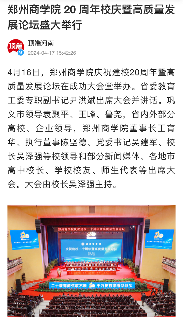 郑商20周年校庆,是学校发展史上具有里程碑意义的一件大事,凝聚着社会各界的殷切期望,承载着全体郑商人的美好愿景。我校精心谋划了一系列内涵丰富、意义深刻的校庆活动,通过多家媒体的关注报道,全方位展示了学校向上向好的发展态势和全体师生员工团结奋斗的精神面貌。上级部门、友好单位、校友、家长和社会各界纷纷点赞学校的良好校风和丰硕的办学成果,并送上美好真挚的祝福。