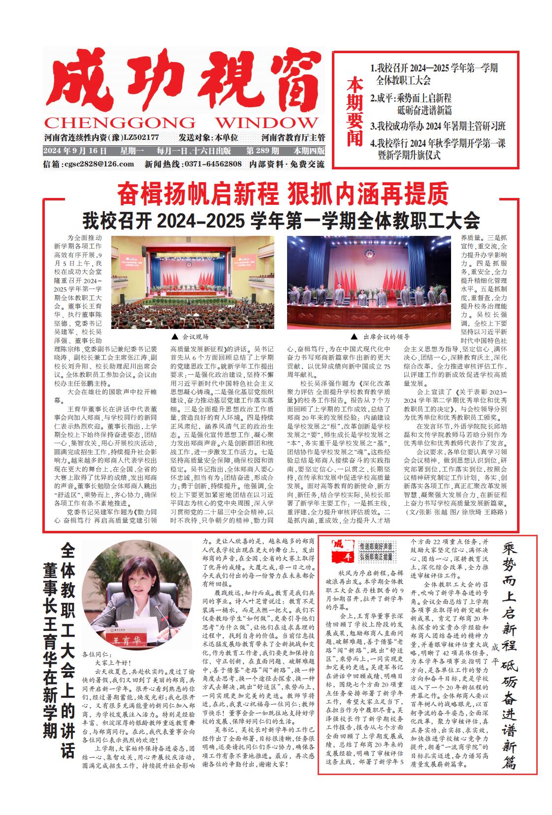全体教职工大会的召开,吹响了新学年奋进的号角。会议全面总结了上学期各项事业取得的新突破和新成果,肯定了郑商20年来探索的宝贵的办学经验和郑商人团结奋进的精神力量,并站位发展全局,着眼审核评估重大战略,明晰了42项重点工作,为本学年工作分析了形势、指明了方向,是各单位本学年工作的努力方向和奋斗目标,更是学校迈入下一个20年新征程的开幕之作。全体郑商人要以百年树人的战略眼光,以百舸争流的奋斗姿态,全面深化改革,聚力审核评估,真正务实功、出实招、求实效,加快推进学校核心竞争力提升,朝着“一流商学院”的目标扎实迈进,奋力谱写高质量发展崭新篇章。