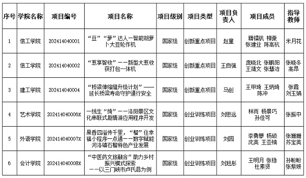 根据教育部《关于公布2024年国家级大学生创新训练计划项目名单和结题验收结果的通知》(教高司函〔2024〕13号)和河南省教育厅《关于公布2024年大学生创新训练计划项目名单和结题验收结果的通知》(教高〔2024〕376号),我校申报的10个大学生创新训练计划项目获批国家级6项、省级3项,国家级项目立项数量取得新突破,具体名单如下: