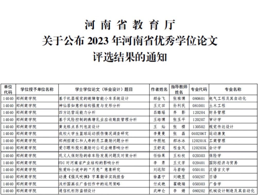 近日,河南省教育厅发布《关于公布2023年河南省优秀学位论文评选结果的通知》(教研〔2024〕369 号),我校金融与贸易学院保险学专业任怡果、文学与新闻传播学院汉语言文学专业刘远阳等14名学生的毕业论文(设计)获评2023年河南省优秀学士学位论文(设计)。