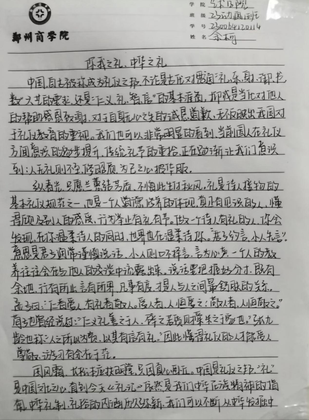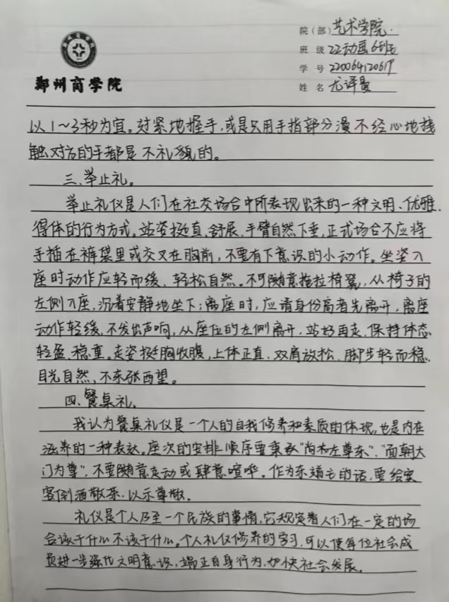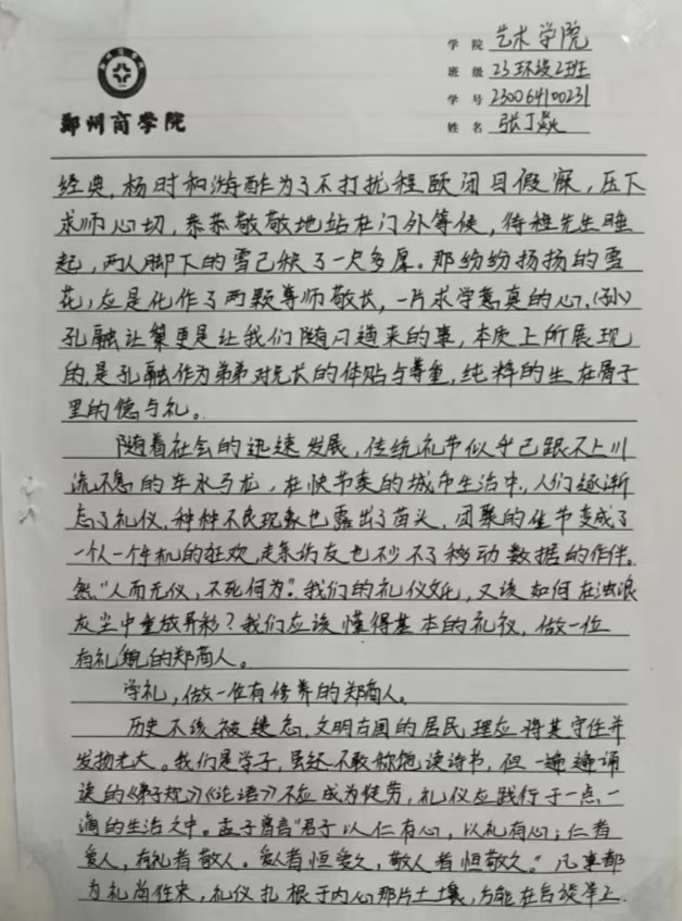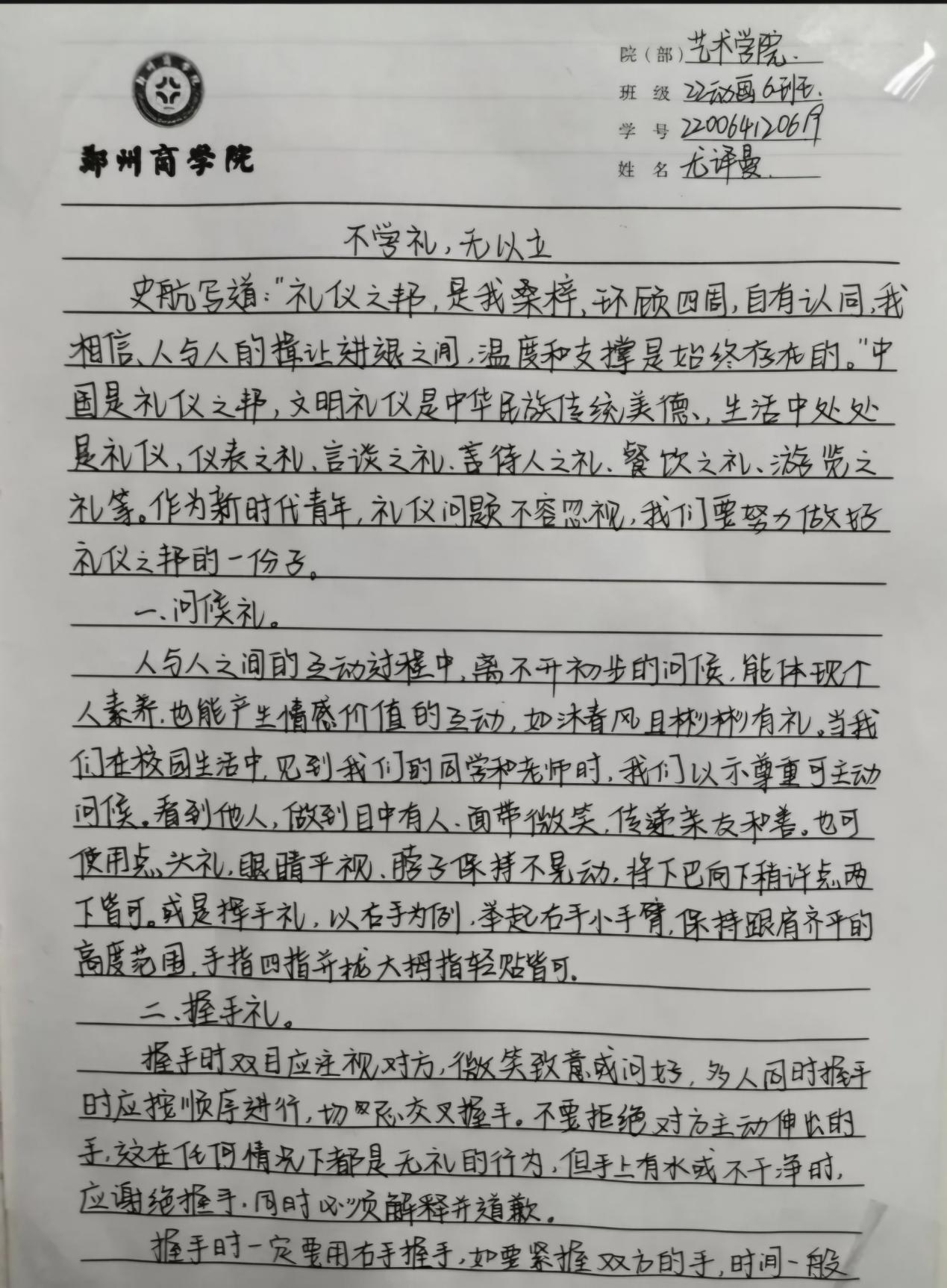 为丰富我校大学生课外文化生活,增强大学生礼仪素养,丰富社交礼仪知识储备,引导每一位同学“知礼、懂礼、学礼”,艺术学院特举办“知礼、学礼、懂礼”主题征文活动,以展现艺术学院学子学习文明礼仪的优秀风采。
