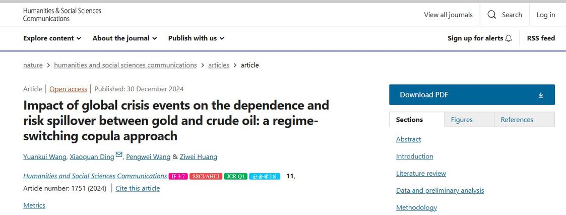 近日,我校通识中心教师王元魁以第一作者在Humanities and Social Science Communications发表题为“Impact of global crisis events on the dependence and risk spillover between gold and crude oil: a regime-switching copula approach”的论文,讨论了全球危机事件对黄金和原油之间依赖结构以及风险溢出的影响。