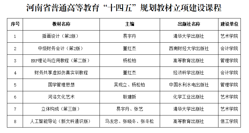 近期,河南省教育厅发布了《河南省第二批普通高等教育“十四五”规划教材立项建设名单》(教高〔2025〕27号)。我校管理学院、信工学院和艺术学院申报的《国学管理思想》《人工智能导论(新文科通识版)》《河洛文化艺术》《立体构成(第三版)》4部教材成功入选重点关键领域系列核心教材建设项目。截至目前,我校共计8部教材入选河南省“十四五”普通高等教育规划教材。
