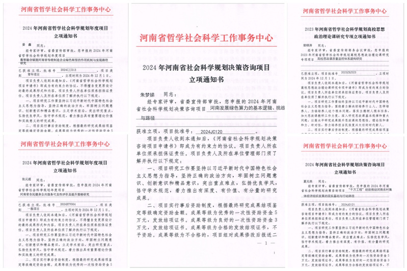 根据河南省哲学社会科学工作事务中心的通知,我校获批2024年河南省哲学社会科学规划年度项目2项、2023年河南省哲学社会科学规划高校思想政治理论课研究专项1项、2024年度河南省社会科学规划决策咨询项目2项。