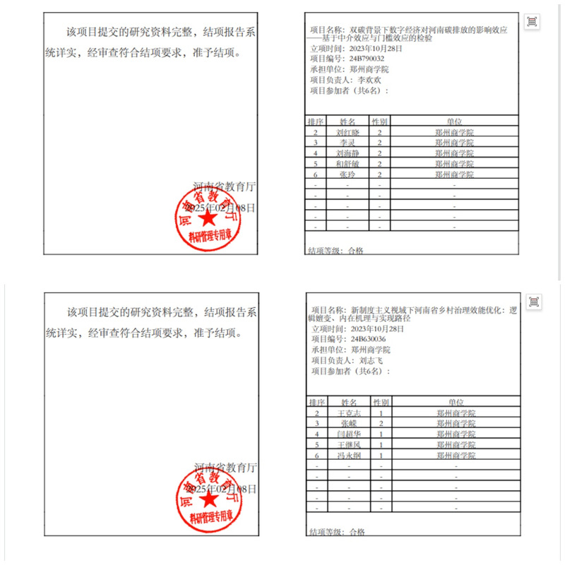 2024年度河南省高等学校重点科研项目顺利结项2项,分别是管理学院李欢欢老师主持的“双碳背景下数字经济对河南碳排放的影响效应——基于中介效应与门槛效应的检验”课题和科研处刘志飞同仁主持的“新制度主义视域下河南省乡村治理效能优化:逻辑嬗变、内在机理与实现路径”课题。