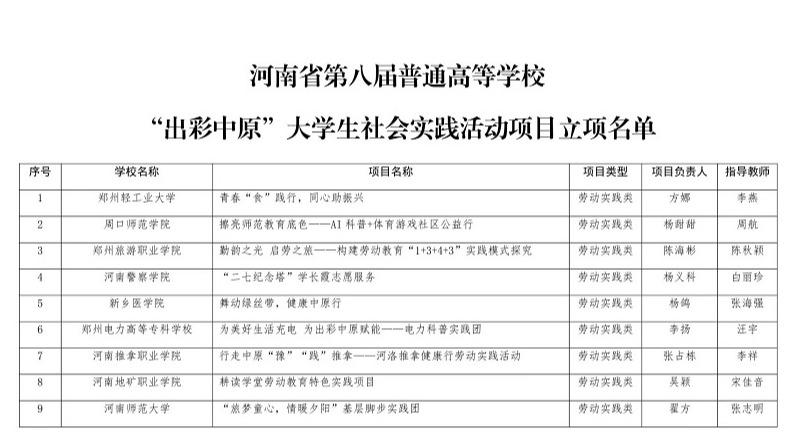 日前,河南省教育厅公布《河南省教育厅关于公布普通高等学校“出彩中原”大学生社会实践活动项目立项、结项及等次评定结果的通知》,我校外国语学院申报的《唤醒文物记忆·讲好中国故事——用中华优秀文化涵育青年文化自信的路径探析》项目成功立项。