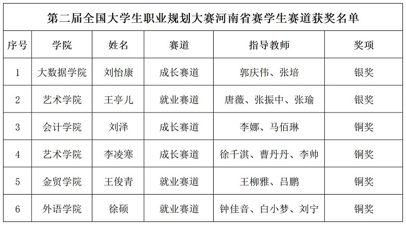 学生赛道共吸引全省174所高校参与,146万学子报名参赛。校赛阶段,为营造全员参与、协同共进的比赛氛围,我校积极响应省教育厅相关文件精神,拨付专项经费,全力保障赛事成效;围绕“主体赛事”开展包括职业生涯咨询、职业体验、赛事解读等多项专项活动,显著扩大了赛事的覆盖面和影响力。决赛参赛选手们的职业目标紧扣国家战略与区域经济发展需求,展现出郑商学子的“择业观”与“家国情”。最终,刘怡康、王亭儿荣获银奖,李凌寒、刘泽、王俊青、徐硕荣获铜奖。