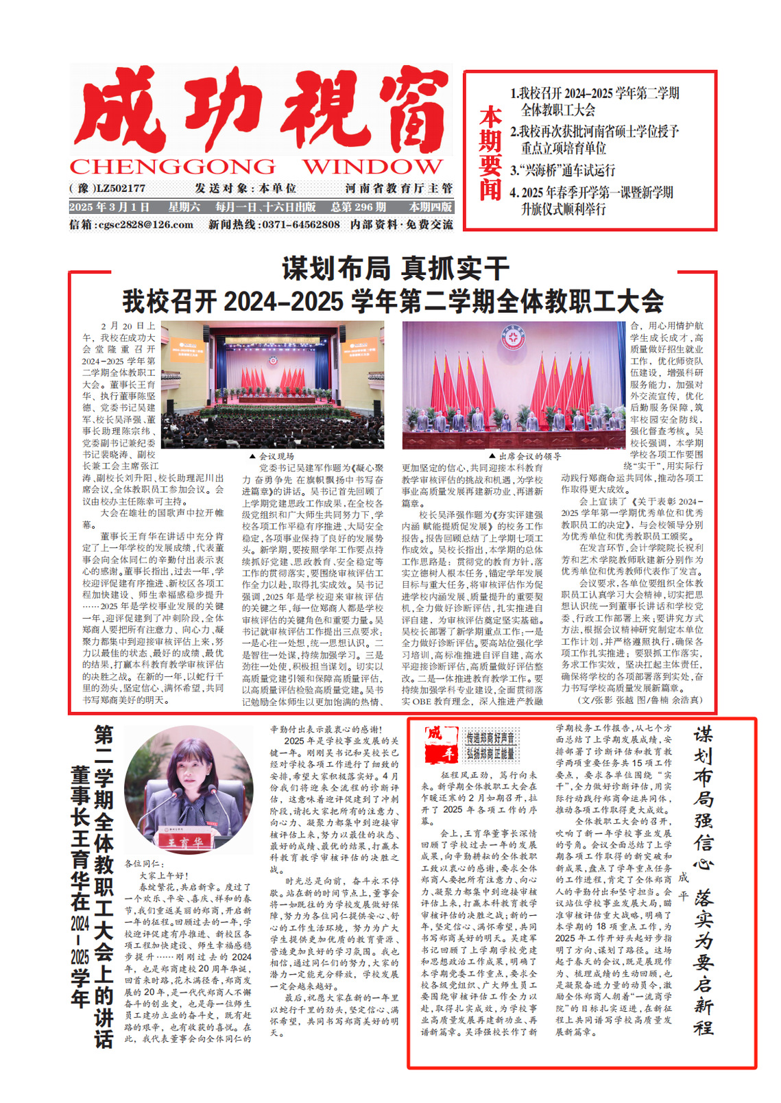 全体教职工大会的召开,吹响了新一年学校事业发展的号角。会议全面总结了上学期各项工作取得的新突破和新成果,盘点了学年重点任务的工作进程,肯定了全体郑商人的辛勤付出和坚守担当。会议站位学校事业发展大局,瞄准审核评估重大战略,明确了本学期的18项重点工作,为2025年工作开好头起好步指明了方向、谋划了路径。这场起于春天的会议,既是展现作为、梳理成绩的生动回顾,也是凝聚奋进力量的动员令,激励全体郑商人朝着“一流商学院”的目标扎实迈进,在新征程上共同谱写学校高质量发展新篇章。