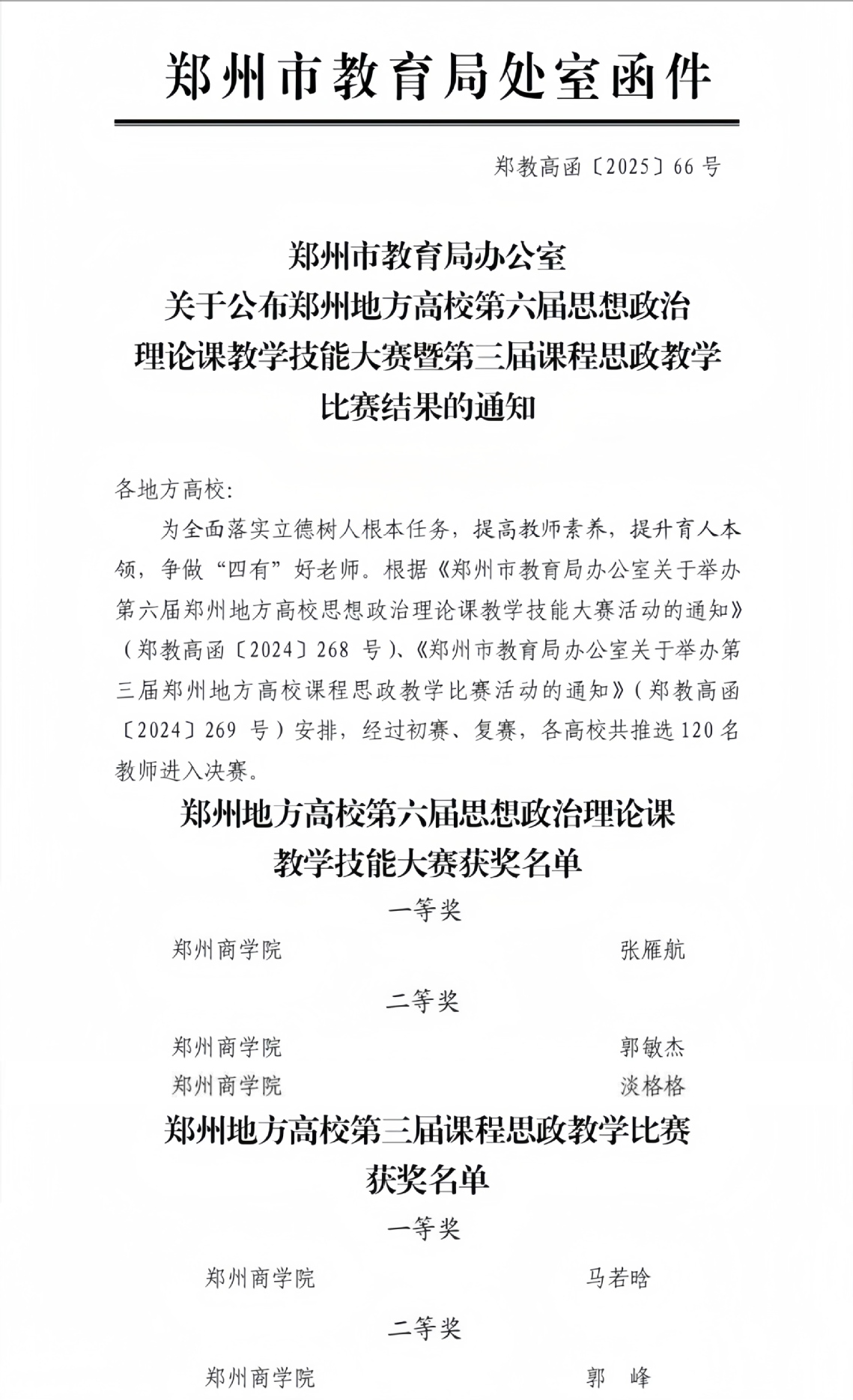 近日,郑州市教育局发布《关于公布郑州地方高校第六届思想政治理论课教学技能大赛暨第三届课程思政教学比赛结果的通知》(郑教高函〔2025〕66 号),我校张雁航老师获第六届思想政治理论课教学技能大赛一等奖,郭敏杰、淡格格老师获二等奖;马若晗老师获第三届课程思政教学比赛一等奖,郭峰老师获二等奖。