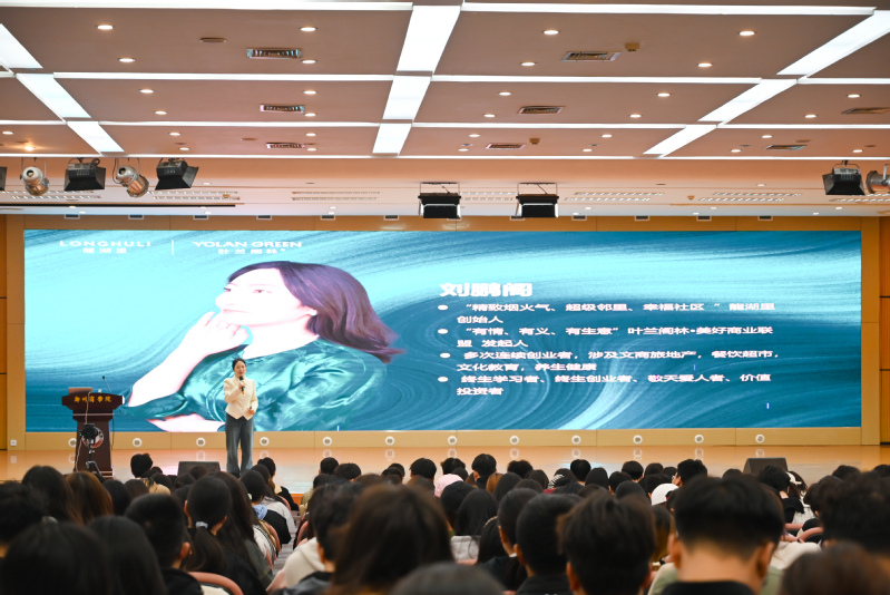 仪式结束后,刘鹏阁董事长一行实地考察了校园环境,并在图书馆一楼国际报告厅开展了题为“新媒体赋能新商业”的讲座。活动现场,刘鹏阁董事长从创业历程、商业街区打造理念、龙湖里公益行等方面进行了分享,并结合新媒体赋能商业转型的实际案例,鼓励学生们保持耐心、有条不紊地做事,为未来的职业发展打下坚实基础。
