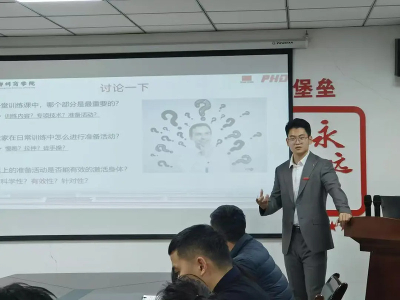 其次,白云瑞老师以“运动前的动作准备”为题,提出日常训练中进行准备活动时,应具有科学性、有效性、针对性。将准备活动、训练技术、训练内容三者间相互融合,将准备动作分为“肌肉激活、动态拉伸、动作整合、神经激活”四个方面进行具体解释说明,倡导实施行之有效的方法,做好训练前热身动作。