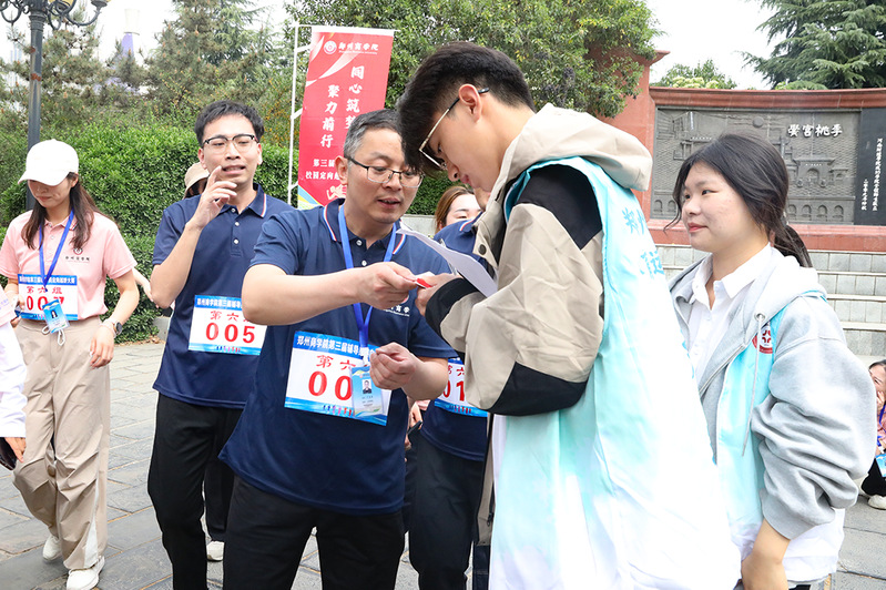 经过一个小时的激烈比拼,所有队伍全部顺利抵达终点。党委副书记裴晓涛现场宣布比赛结果:“五与伦比队”以最短用时摘得桂冠,“郑商先锋队”与“郑商追光队”分获二、三名。颁奖环节,校领导分别为获奖团队颁发荣誉证书,并寄语全体辅导员将赛场上的拼搏精神延续至育人工作中。