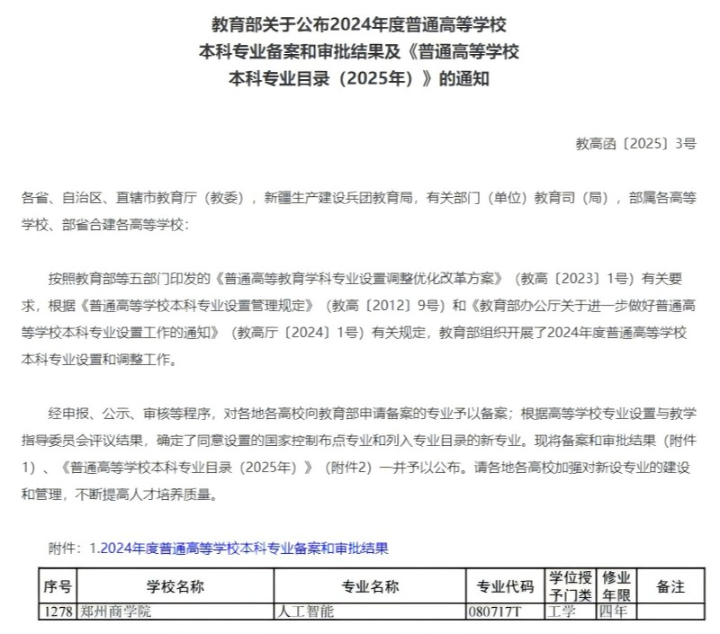 近日,教育部公布了2024年度普通高等学校本科专业备案和审批结果,我校申报的人工智能本科专业成功获批。