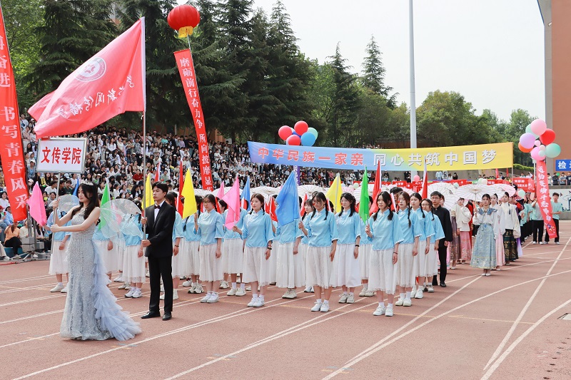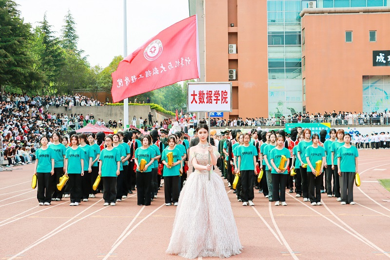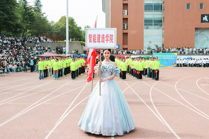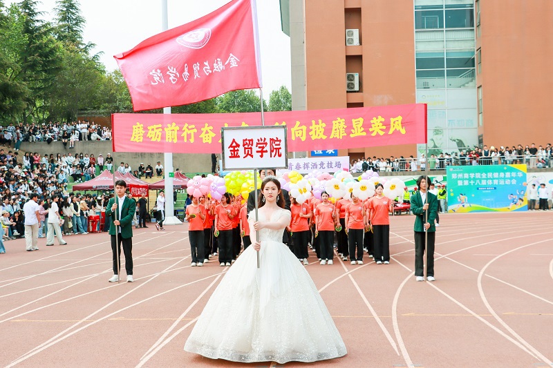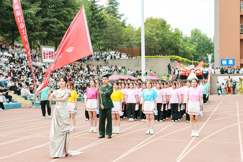 在活泼有力的《运动员进行曲》旋律中,裁判员方阵、教职工代表队、各学院学生代表队依次闪亮登场。裁判员们身着统一制服,步伐稳健,神情专注,他们将以专业素养为尺,以严谨态度为秤,全程坚守、一丝不苟;教职工代表队精神饱满,笑容满面,展现出郑商教师昂扬向上的精神风貌。各学院学生代表队创意无限、精彩纷呈,精心设计了独特的入场形式。管理学院的同学们身着各式的工作服装,目光坚定向前,每一步都踏响着团结的节拍;会计学院的同学们迎着朝阳的光辉,踏着时代的鼓点,昂首阔步;金贸学院特色表演方阵身着蓝橘队服,手持各色太阳花,在阳光下熠熠生辉;“讲好外国语,做好中国人”的口号声响彻云霄,外语学院代表队以自信昂扬的步伐,踏出青春最美的节拍;机电工程学院的同学们身着湛蓝与银灰交织的统一队服,恰似电路板上跃动的电流与精密器械的金属光泽;大数据工程学院用AI造型表演展示学科专业自信,用精细线条连贯天地,以代码逻辑突破极限;鼓声雷雷,雄狮欢舞,艺术学院的同学们眼神自信而坚毅,热忱如火炬,朝气蓬勃、青春洋溢,昂首向前;文传学院同学们以青年风骨为底色,踏着时代的鼓点,在运动场上铺展出一幅流动的百年画卷;智能建造学院的队伍在吉祥物“健健”和“乐乐”的带领下,手持“兴海桥”模型,以专业之力,为时代铺就通向未来的坚实道路;体育学院龙狮协会、健身协会、运动康复协会、田径协会、研究生方阵扬着自信的脸庞,迈着矫健的步伐,依次展现风采。各学院独具匠心的创意设计与别出机杼的精彩呈现,折射出郑商学子天马行空的奇思妙想,展现出全体师生蓬勃昂扬的青春姿态与锐意进取的精神品格。这份创新与活力交织的独特魅力,彰显着师生们敢为人先的朝气与自信向阳的风采。现场欢呼声、掌声此起彼伏。