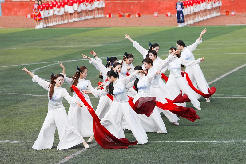 开幕表演精彩纷呈,参演同学们用精湛的技艺和饱满的热情为大家带来了一场视觉盛宴。队形操表演《奔跑的青春》,以青春之名,用整齐划一的动作和充满活力的队形变换,点燃全场热情,他们将现代流行元素与团体操完美融合,通过流畅的走位、创意的造型和极具感染力的表现,展现郑商学子的蓬勃朝气与团队精神;微风缱绻,舞蹈串烧《九州同》,在折扇开合间,东方美学的含蓄与典雅跃然而出,她们以刚健婀娜之姿,编织着一幅绚烂多彩、百花争艳的动人画卷,演绎着坚韧不拔、永不言弃的体育信念。中华战舞《玉盘》鼓声响彻云霄,呼吁着郑商学子勇担中华民族伟大复兴历史重任,将五千年豪情转化为阳刚之气,在新时代发出铿锵回响。
