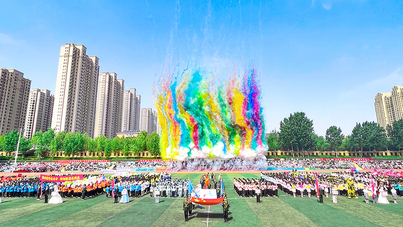 缤纷的彩色烟雾刺破长空,整个运动场被色彩拥抱,欢呼声与鼓掌声裹挟着彩色云雾,将青春、热烈、活力的郑商推向云端。