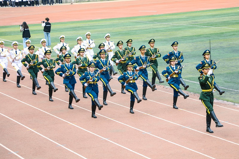 开幕式入场仪式上,国旗护卫队英姿飒爽,迈着整齐有力、气宇轩昂的步伐,护卫着鲜艳的国旗、校旗和象征着团结拼搏、积极向上精神的会徽率先入场。他们坚定的眼神、挺拔的身姿,展现出对国家和学校的深深敬意,也让现场氛围瞬间庄重而热烈。