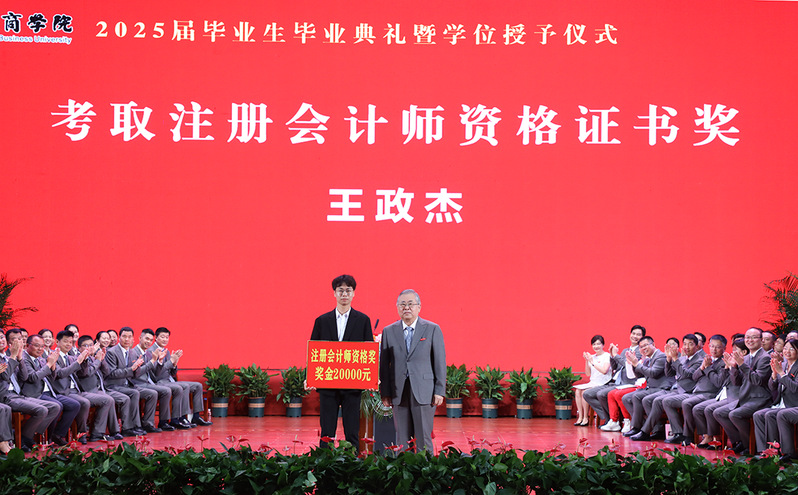 在热烈的掌声中,执行董事陈坚德、党委书记吴建军、董事长助理陈宗纬分别颁发注册会计师资格奖、法律职业资格奖、硕士研究生奖并与获奖同学合影留念;其他校领导分别为获得“省级优秀学生干部”“省级三好学生”“专业综合成绩第一名”“校级优秀毕业生”的毕业生代表颁奖并合影留念。